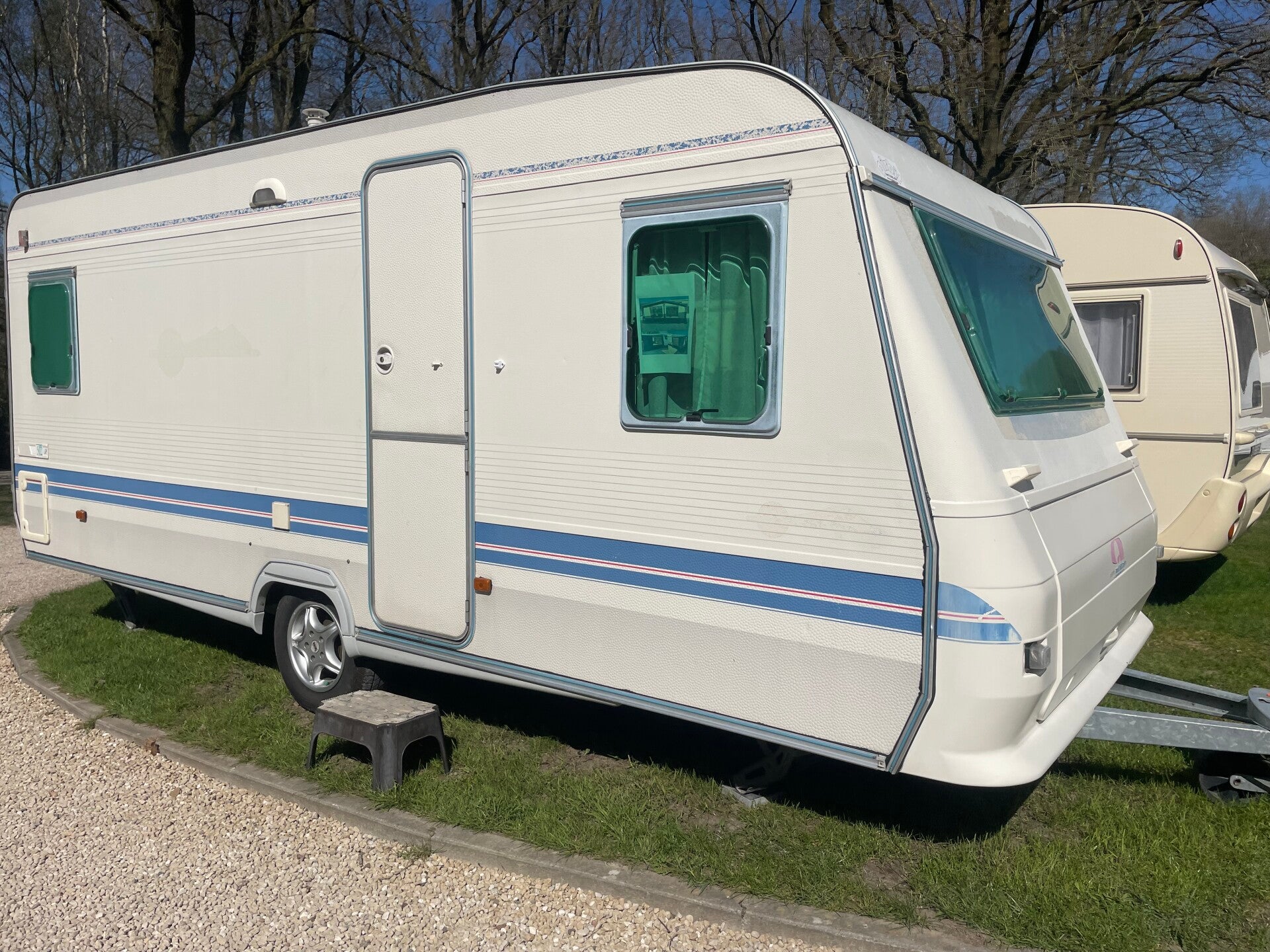 Caravan Adria 502Met voortent met een diepte van 3 mBj 2000Frans bedRondzit omvormbaar naar bedKoelkast met vriesvak, werkt op 220/12 volt en gasSpoelbakKookvuurVeel opbergruimteToilet, lavabo en doucheNieuwe boiler