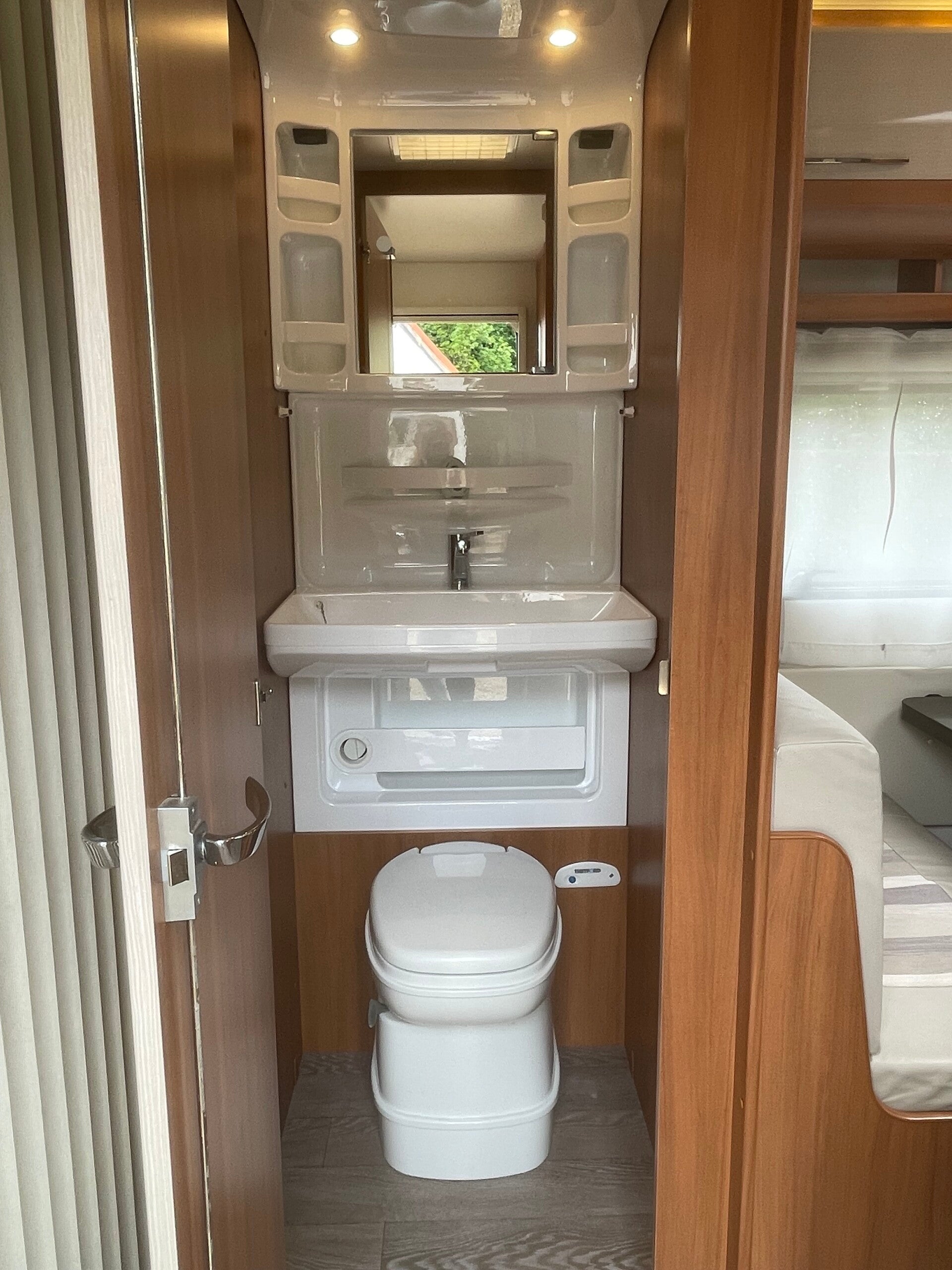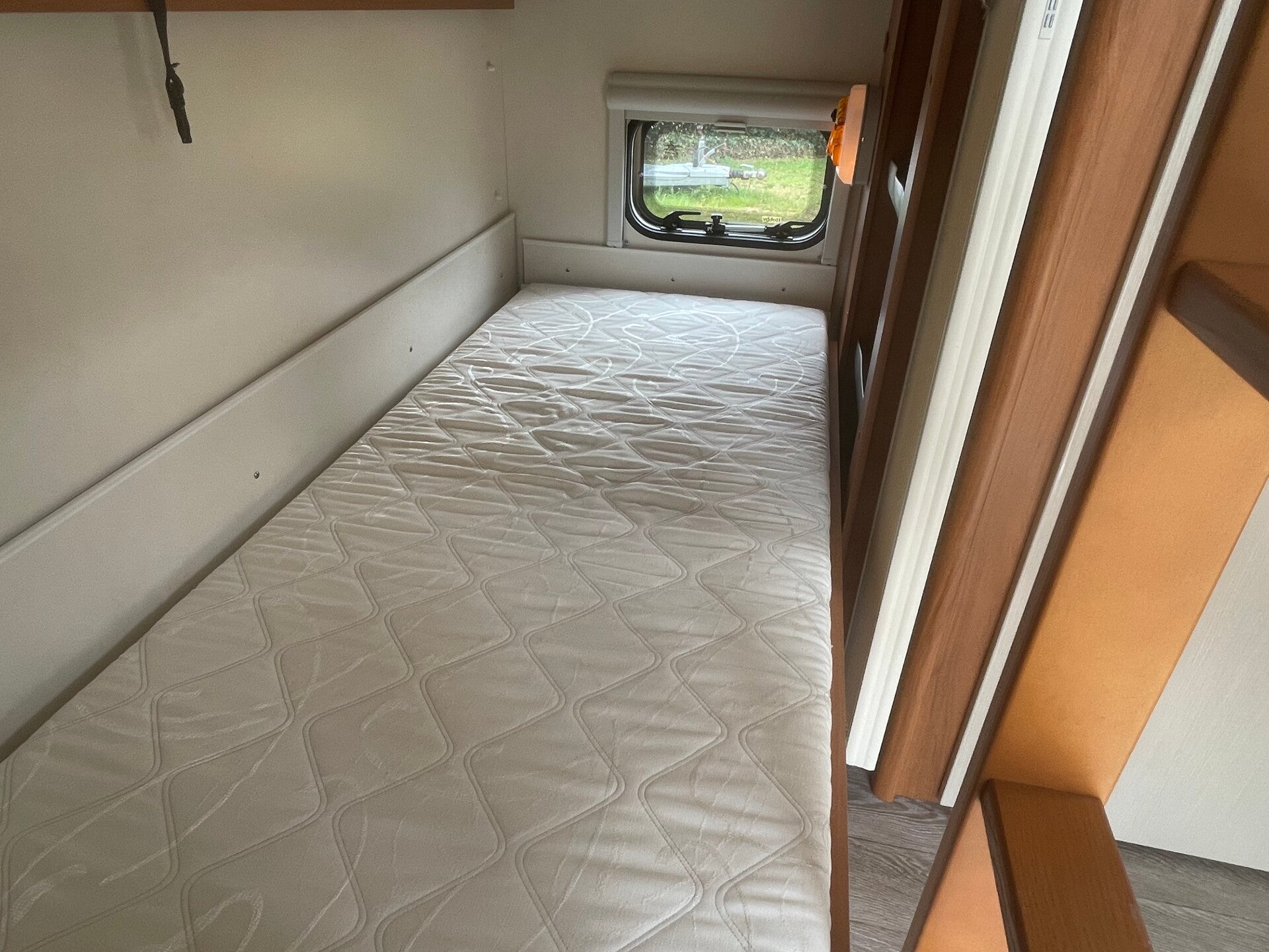 Priveafsluitbaar 2 persoons bed, met veel opbergplaats eronder ook toegankelijk via het serviceluik langs buiten